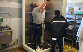 Montaggio di un contenitore per la raccolta del ghiaccio, tramite macchine a scaglie posizionate dal lato superiore.